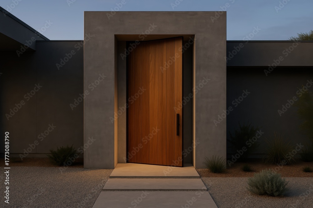 Minimal modern home entry with tall wooden pivot door and cast concrete facade #1773088790