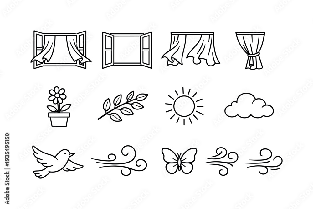 Minimal outline icon set with windows, curtains and decorative home elements. #1935495150