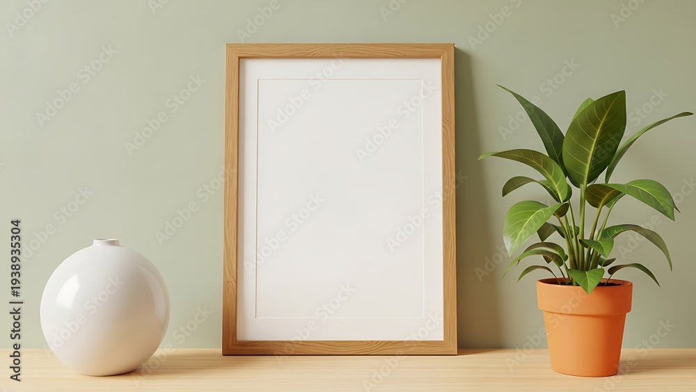 Minimal style Wall frame mockup elegant neutral interior wall decor with empty poster frame modern gallery display background clean home room scene template for artwork showcase branding and marketing #1938935304