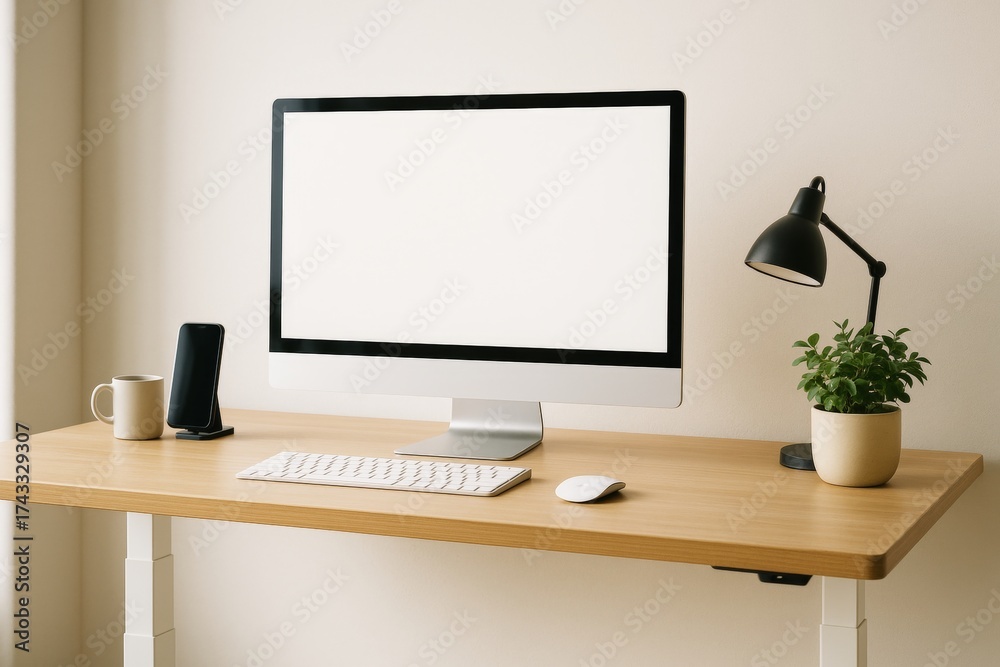 Minimal workspace mockup with blank computer screen on wooden desk featuring smartphone, lamp, mug, and potted plant in bright interior.. #1743329307