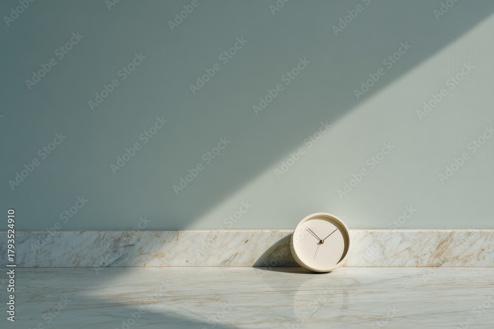 minimalist alarm clock rests elegantly against pastel wall creating calm ambiance #1793524910