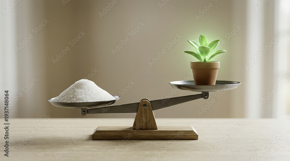 Minimalist balancing scale with pile of white sugar and small green potted plant, symbolizing healthy lifestyle choices #1937148064