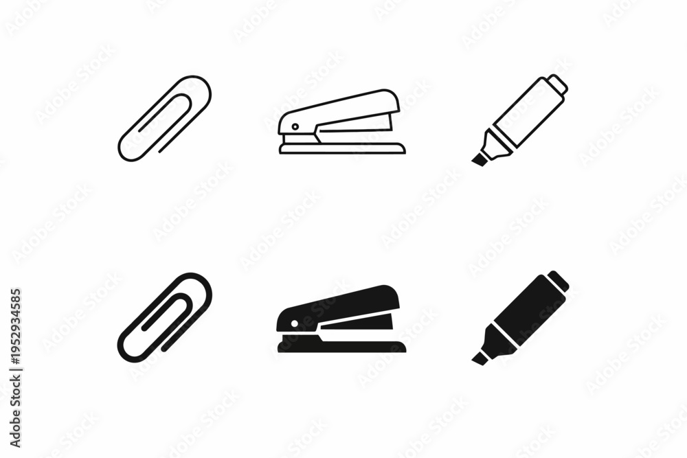 Minimalist black and white icons of office supplies: paperclip, stapler, highlighter #1952934585