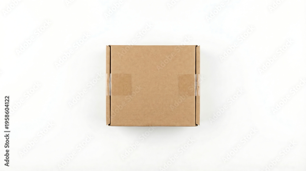 Minimalist Cardboard Box: A perfectly sealed, square cardboard box stands centered, ready for shipping or holding. Embodying simplicity and functional design. #1958604122