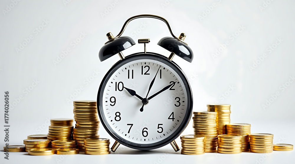 Minimalist clock placed beside golden coins stacks symbolizing time and money management with clean white background #1774026056