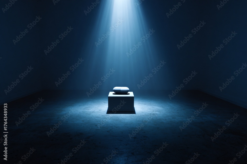 Minimalist composition with a single pill on a pedestal under a bright spotlight, surrounded by darkness, with a prominent price tag, concept of focal importance on drug pricing, monochrome blue and #1764348933