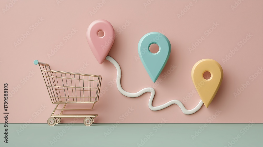 Minimalist conceptual image features pastel shopping cart connected to colorful location pins, symbolizing online shopping and delivery. soft colors create calm and modern aesthetic #1739588193