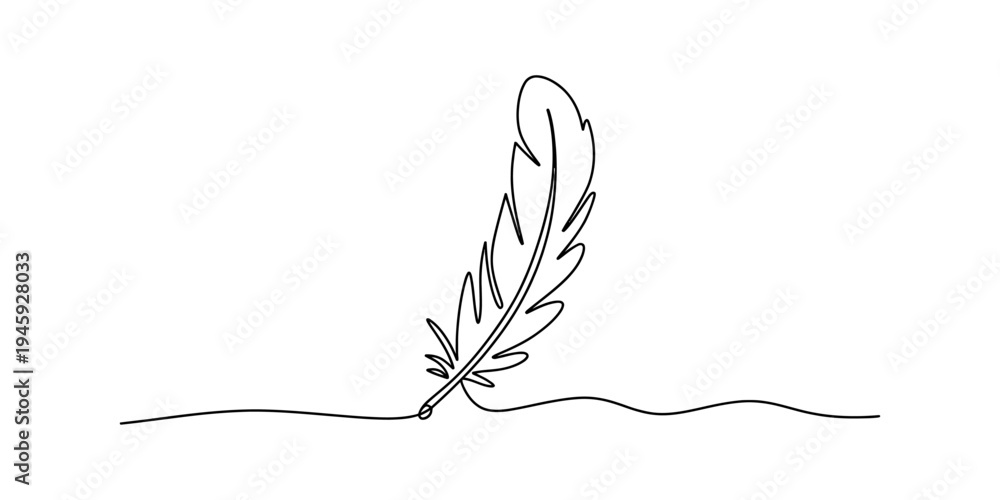 Minimalist continuous line drawing of a feather acting as a quill pen, writing a simple wavy line Vector, illustration #1945928033