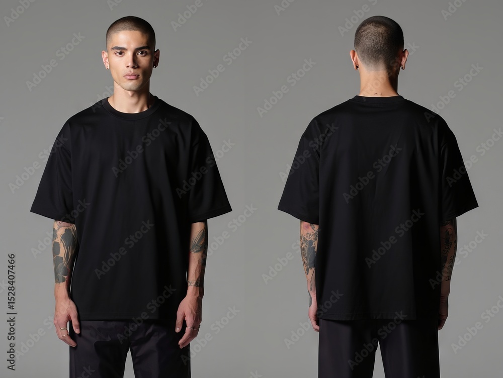 Minimalist fashion: front and back view of unisex black t shirt design for apparel mockup #1528407466