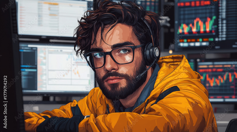 Minimalist flat illustration of a cool stock trader on white background, using bright colors and clean vector style, ideal for UI, Dribbble, or digital design projects. #1779714292