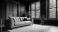 Minimalist grayscale lounge with sofa, rug, and a single plant near a window against a bold wall #1958337500