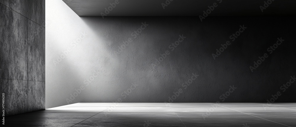 Minimalist interior space features monochrome design with concrete floor and walls. Light streams from opening, creating dramatic contrast between light and shadow. simplicity and elegance evoke #1714856283