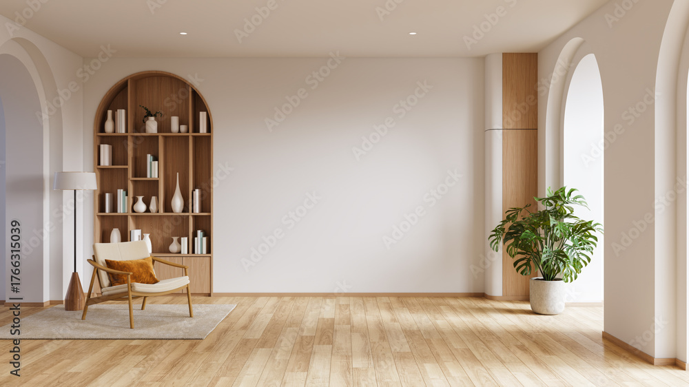 Minimalist interior with a modern armchair and large empty wall for copy spece, featuring an arched bookcase and indoor plant.3d render. #1766315039