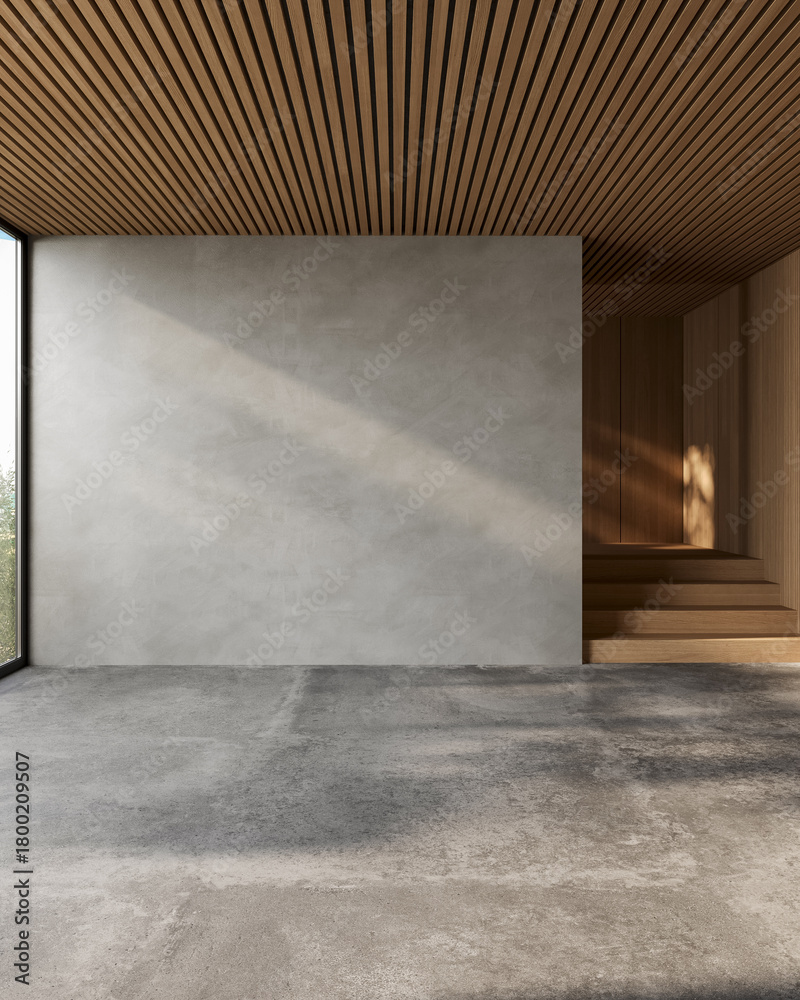 Minimalist interior with textured empty wall, concrete floor and warm wooden finishes, sunlight softly hitting the space, perfect for mockups or background use, 3d render. #1800209507