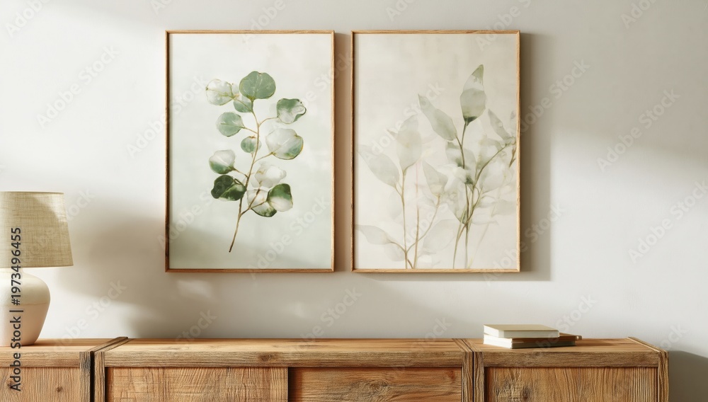 Minimalist interior with two botanical prints above a wooden console table, accompanied by a lamp and books, showcasing natural and rustic decor elements. #1973496455