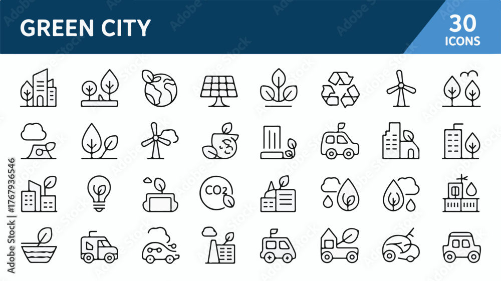 30 minimalist line art icons, white background, blue “GREEN CITY #1767936546