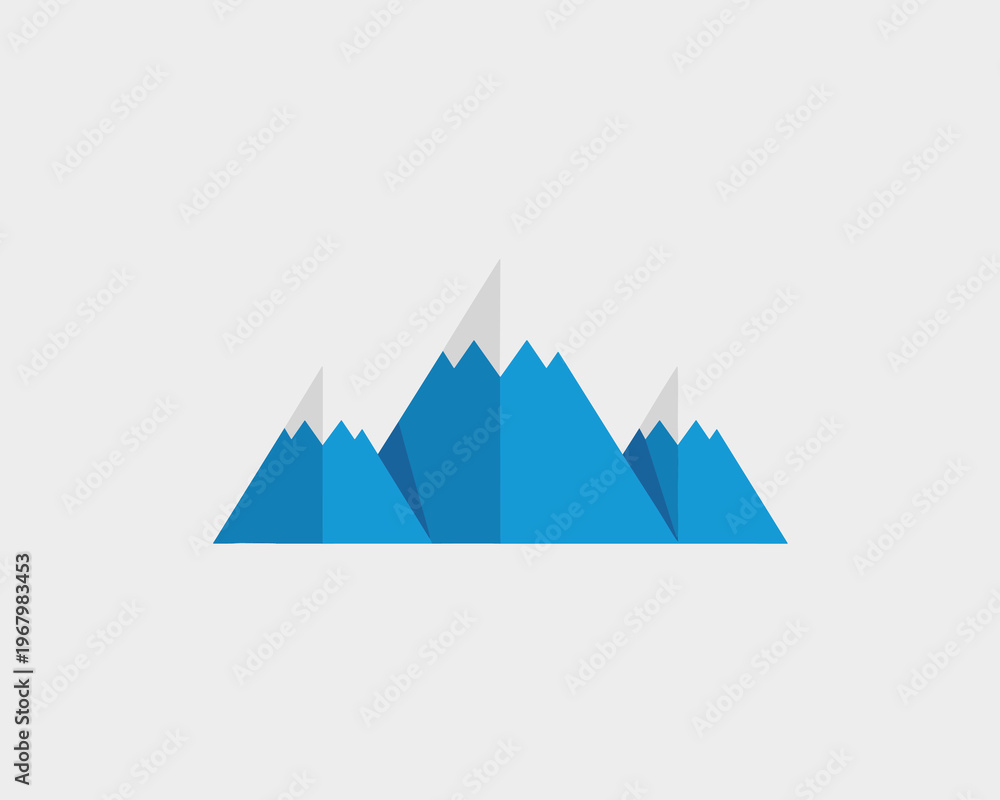 Minimalist mountain range illustration isolated on grey background featuring three triangular peaks with snowy tops, geometric flat design style for outdoor adventure travel branding, conservation, ec #1967983453