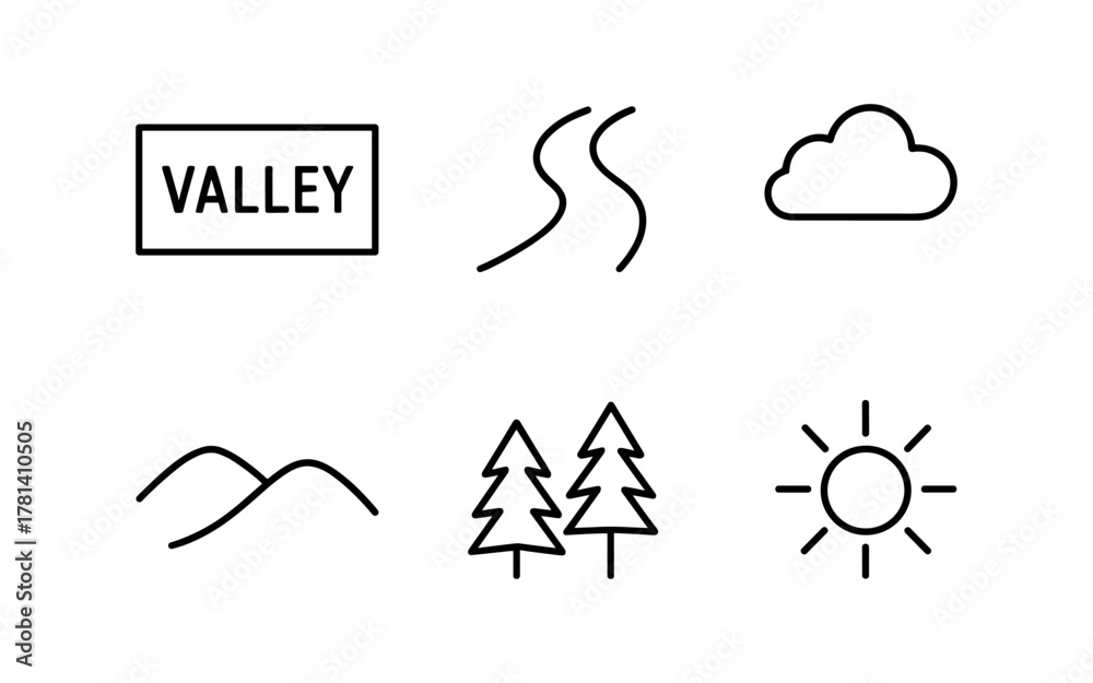 Minimalist nature icons set featuring trees, sun, mountains, cloud, and valley sign #1781410505