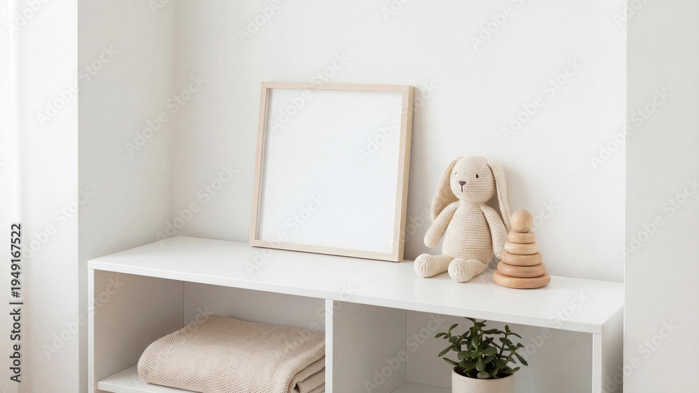 Minimalist neutral toned nursery shelf with handmade knitted toy and wooden stacking rings for infant room decor and early childhood development #1949167522
