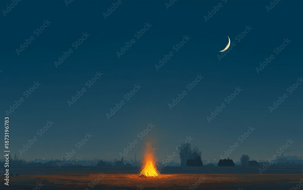 Minimalist night bonfire under crescent moon in open field, calm serene landscape with glowing embers, dreamy background for posters, book covers, banners and wallpapers #1873196783