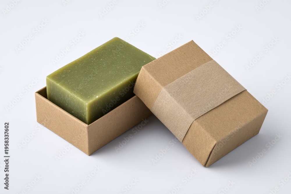 Minimalist olive soap bar with natural kraft wrap and simple packaging on a white studio backdrop #1958337602