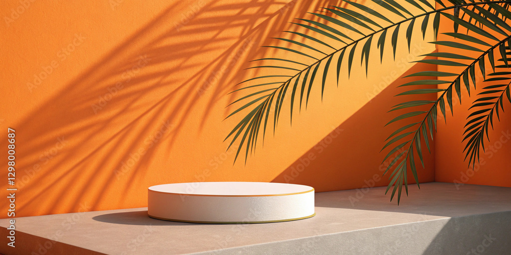 Minimalist orange background with a white podium and palm shadows – a trendy mockup scene for product display, branding, or cosmetic marketing. #1298008687