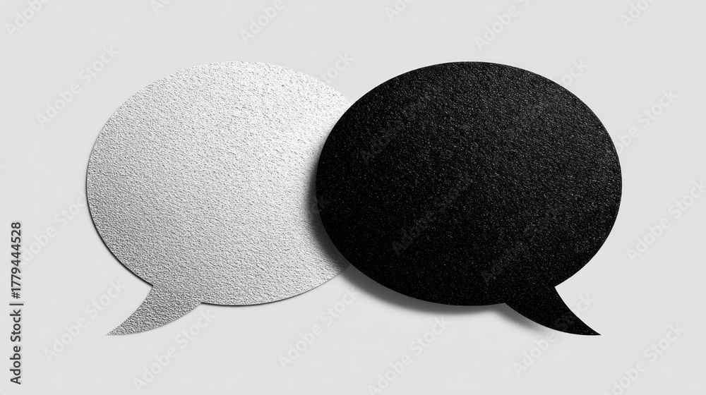 minimalist poster of two overlapping speech bubbles one filled with white noise, the other blank symbolic stillness and tension #1779444528