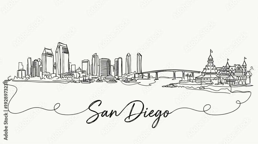 Minimalist San Diego California skyline and bridge panorama line art vector illustration #1928973231