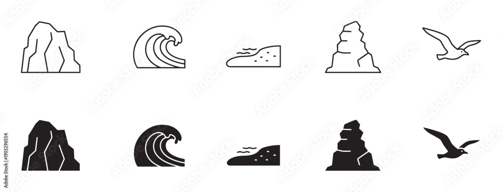 Minimalist seaside and coastal icon set featuring a mountain, ocean wave, beach, cliff, and bird presented in both thin line and filled silhouette versions #1903296554