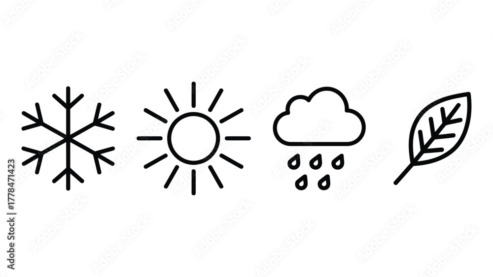 Minimalist Weather and Season Icons Pack: Snowflake, Sun, Rain, Leaf Symbols. #1778471423
