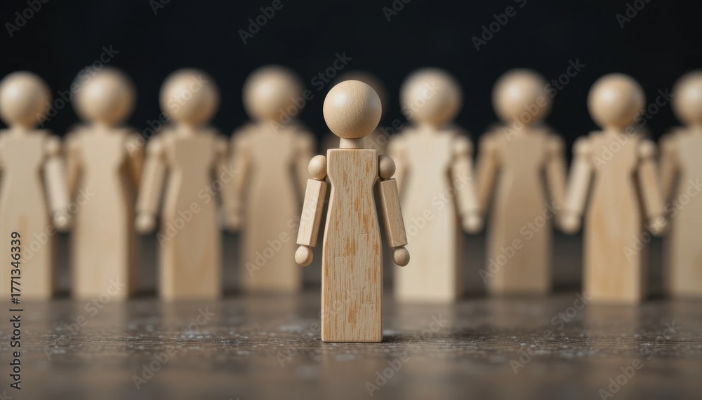 Minimalist wooden people figures, concept of loneliness and lack of communication, sad dark pawn standing alone with group nearby #1771346339
