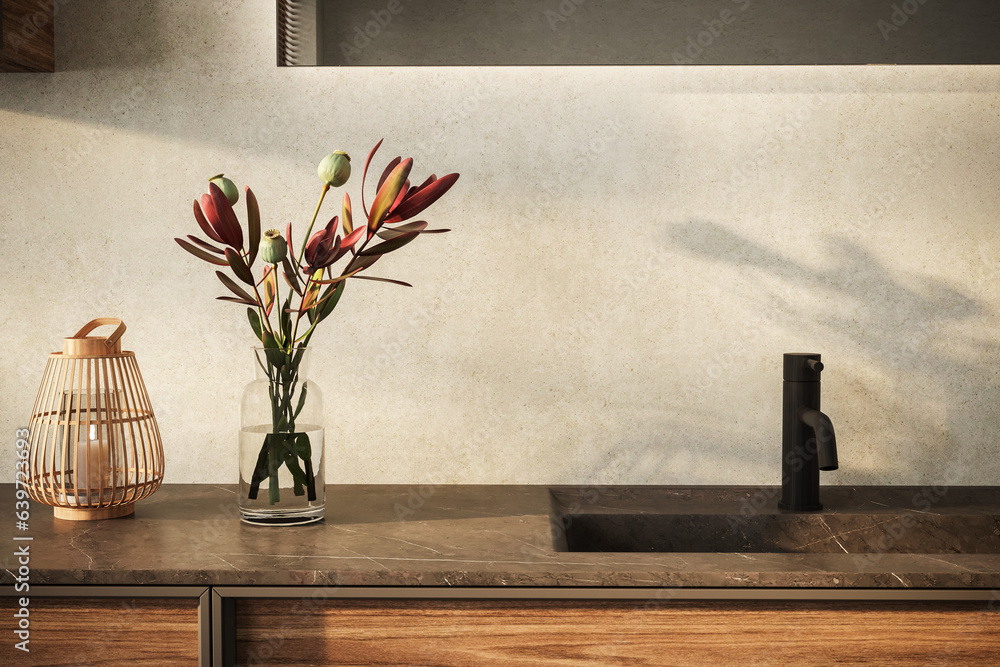 Minimalistic bathroom featuring a marble basin with black faucet and mirror, flower . This mockup-ready countertop can serve as a display stand for bathroom products 3d Rendering #639723693