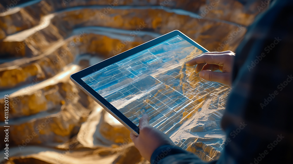 Mining engineer reviewing digital plans of the mining site on a tablet. Featuring technology and analysis #1411322073