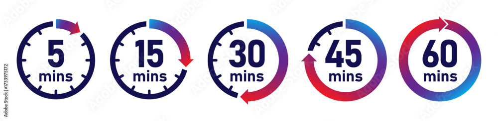 Minute timer icon set with 5, 15, 30, 45 and 60 minutes logo vector in red blue gradient #1733975172
