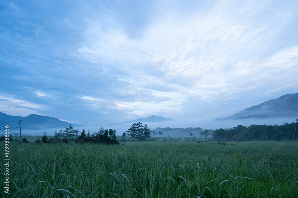 Misty early morning scenery of a vast marshland and mountains. #1739336556