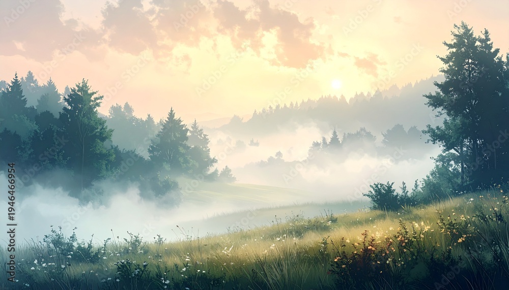 Misty Forest Landscape at Sunrise with Trees. #1946466954