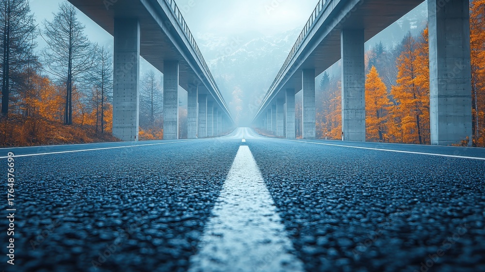 Misty road journey through autumn landscape mountain highway photography atmospheric low angle view tranquility and adventure #1764876699