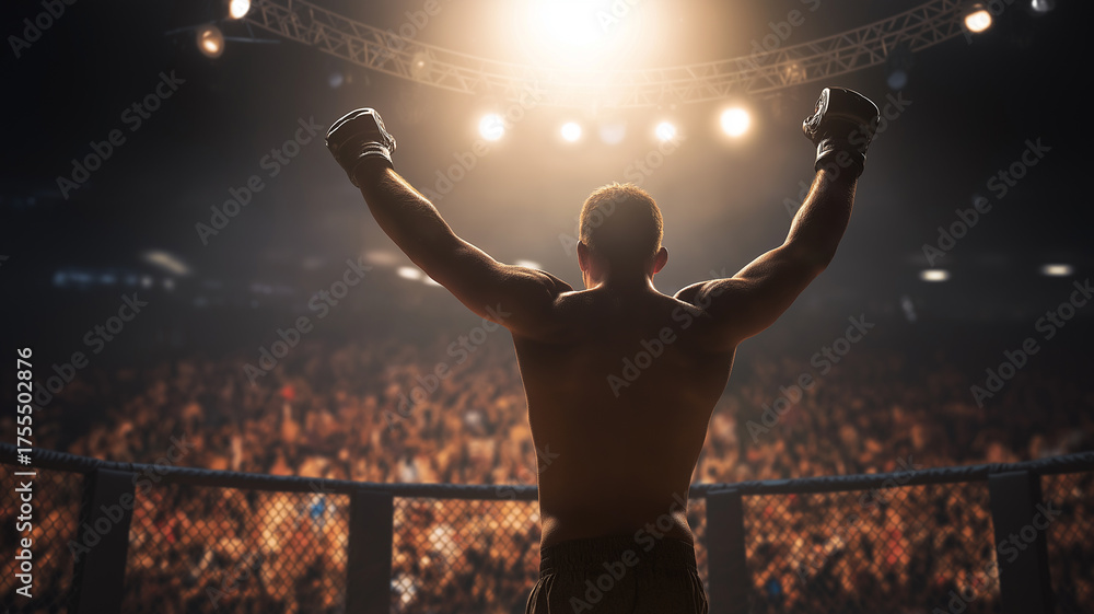 MMA fighter raising arms after victory in octagon cage #1755502876
