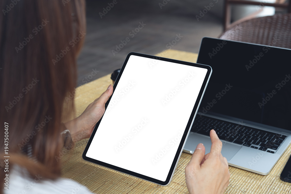 Mockup blank screen digital tablet, woman hands holding tablet with empty screen during working at cafe #1947500407