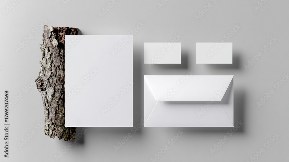 Mockup de papelería blanca con sobre, tarjetas y hoja sobre fondo gris junto a tronco de madera natural en composición minimalista y moderna #1769207469