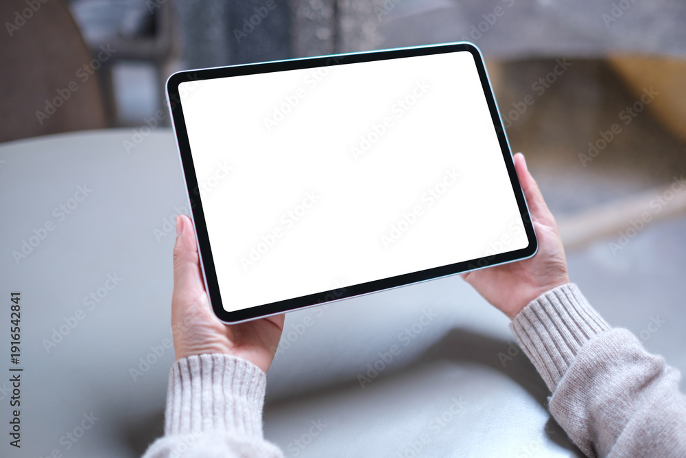 Mockup image of a woman holding digital tablet with blank white desktop screen #1916542841