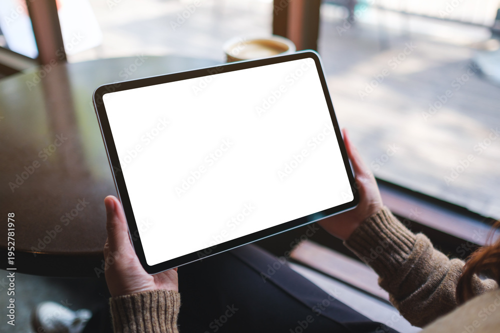 Mockup image of a woman holding digital tablet with blank white desktop screen in cafe #1952781978