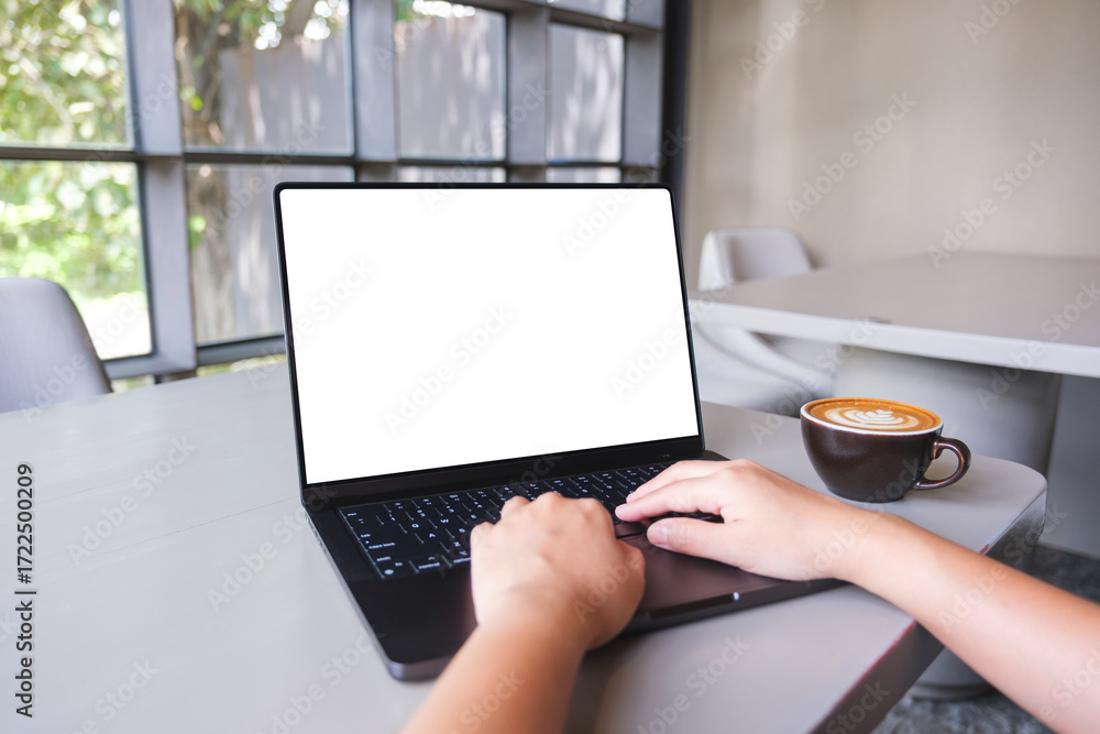 Mockup image of a woman working and typing on laptop computer with blank white desktop screen in cafe #1722500209