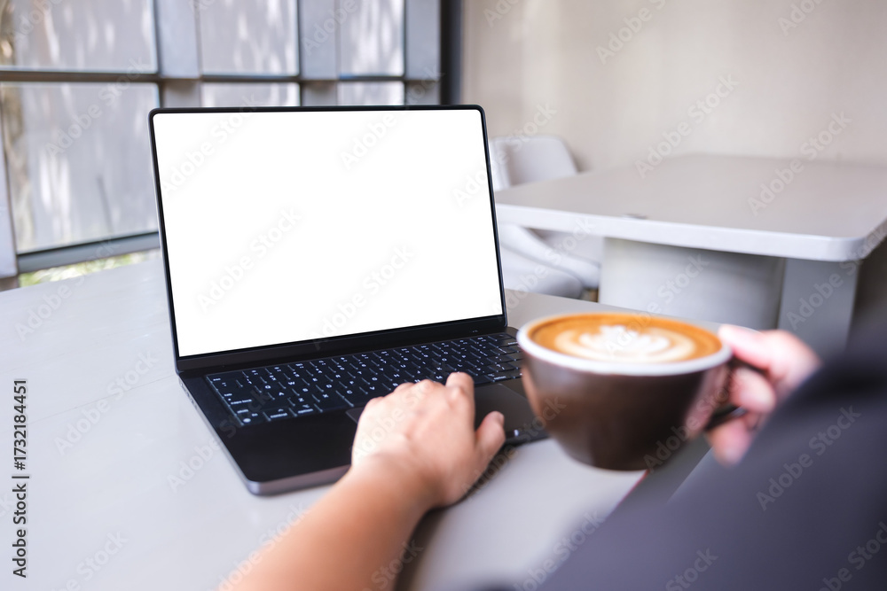 Mockup image of a woman working on laptop computer with blank white desktop screen while drinking coffee in cafe #1732184451