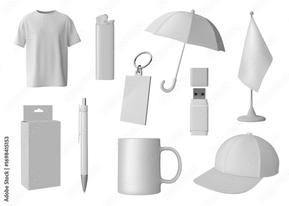 Mockup items. Corporate brand souvenirs. Identity products like stationery pen or cup. T-shirt business branding. White blank mug. Umbrella and hat. Pencil box cover. Vector 3D objects set #1698415153