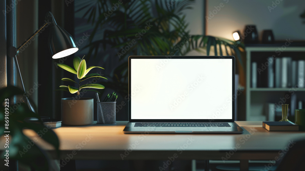 Mockup of a white laptop screen for presentation of website design, etc. There is an open laptop on a desk in a dark room #869109223