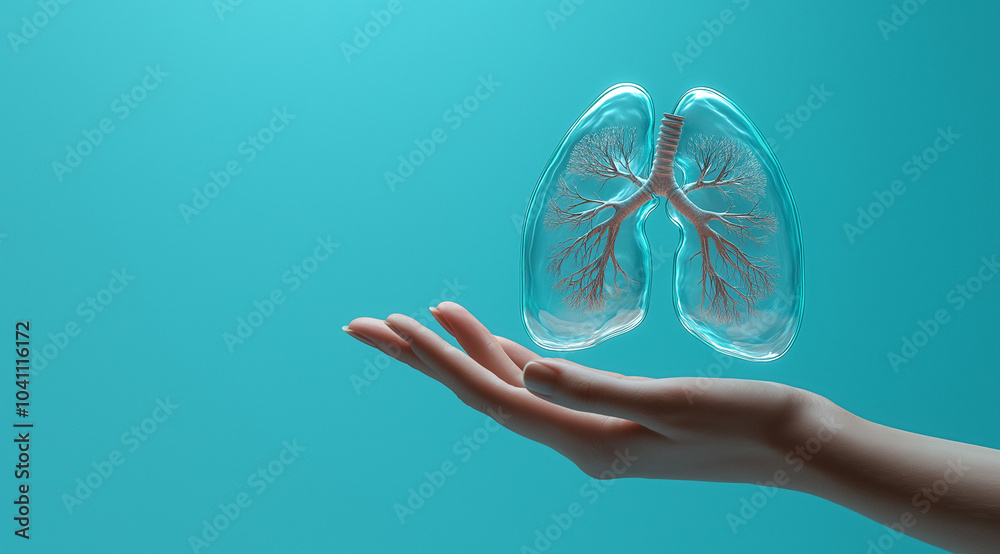 Mockup of clean healthy human lungs in hand on blue background with space for text, created with Generative AI technology #1041116172