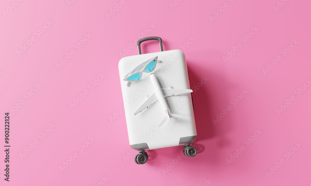 Mockup suitcase with sunglasses and model airplane on pink background. travel concept. 3d rendering #900222124