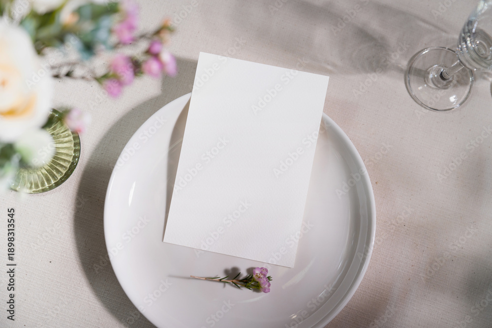 Mockup white blank space card, for Greeting card, invitation on wedding table setting background. with clipping path #1898313545