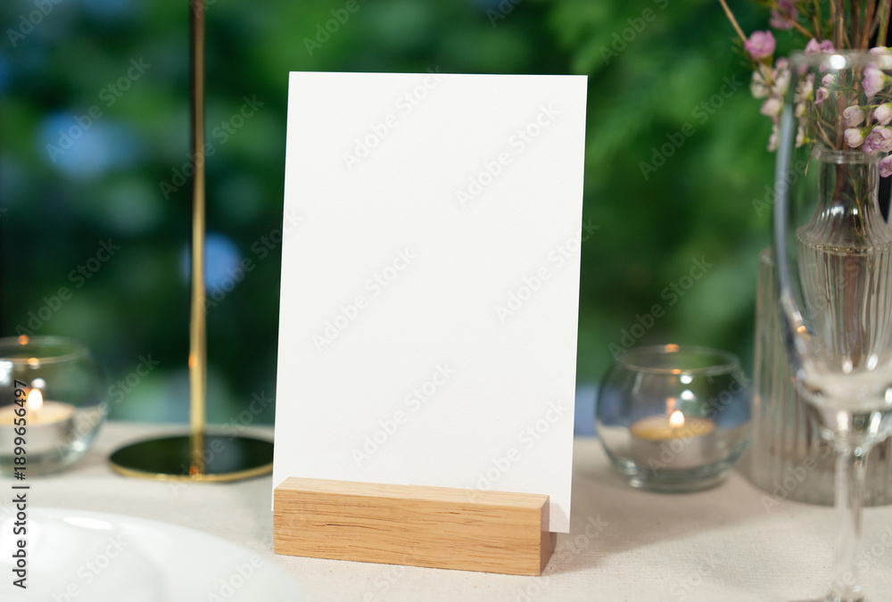 Mockup white blank space card, for greeting, table number, wedding invitation template on wedding table setting background. with clipping path #1899656497